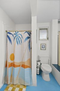 -Spacious bathroom with shower, shampoo, conditioner, body wash, towels