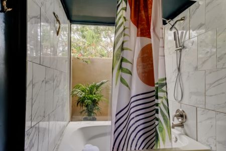 -Spacious bathroom with shower, shampoo, conditioner, body wash, towels