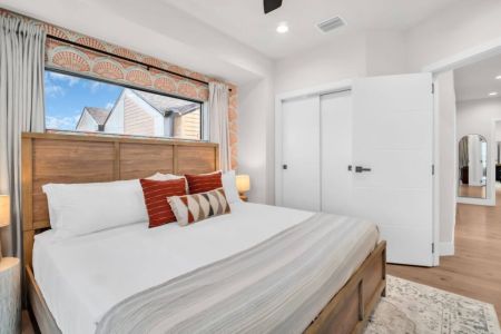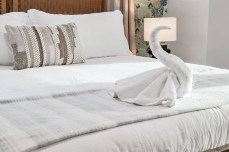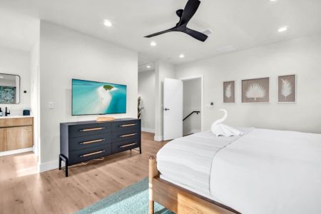 • Reef Room: Primary with private balcony + patio furniture (perfect for watching the sunset), ensuite luxury bathroom and desk area. King Helix bed, 4K 55” Smart TV, ensuite bathroom with soaking tub, walk-in shower, dual sinks, water closet, wardrobe closet, dresser, fan, blackout curtains, dimmable lights, full length mirror, extension cables for chargers. Located on top level.