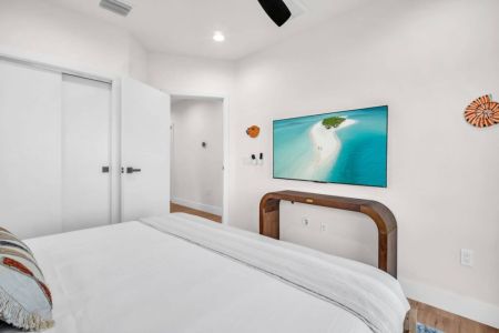 • Oyster Room: (Secondary Primary) Queen Helix bed, private balcony + patio furniture (perfect for looking at the bay and watching the sunrise), 4K Smart TV, built-in closet, fan, blackout curtains, dimmable lights, full length mirror, extension cables for chargers. Located on second level.