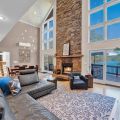 • Luxurious living room: floor to ceiling stone fireplace, 75" 4K Smart tv, subwoofer, soundbar, Modani leather sectional (and a wall of windows overlooking the lake.