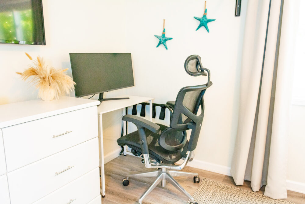 🌊 Coastal Room (First Floor): King bed, dedicated workspace with a desk, monitor + ergonomic chair.